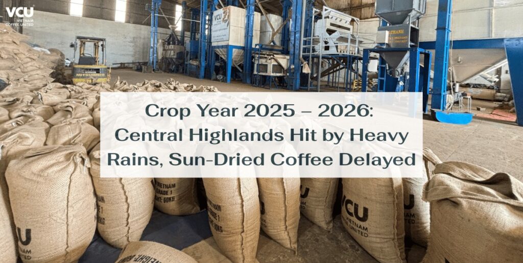 Niên vụ 2025 – 2026 đang diễn ra trong thời điểm sôi động nhất, thời tiết khắc nghiệt tại các tỉnh Tây Nguyên như mưa lớn, lũ lụt và sạt lở đang làm gián đoạn. Điều này cũng làm hạn chế khả năng phơi nắng, kéo dài thời gian hoàn thiện đơn hàng phơi nắng vụ mới.